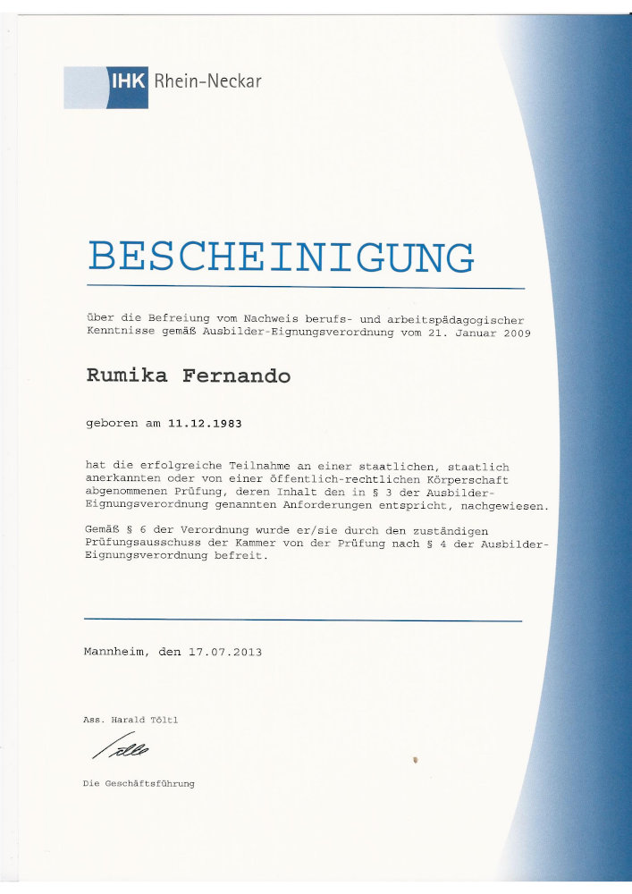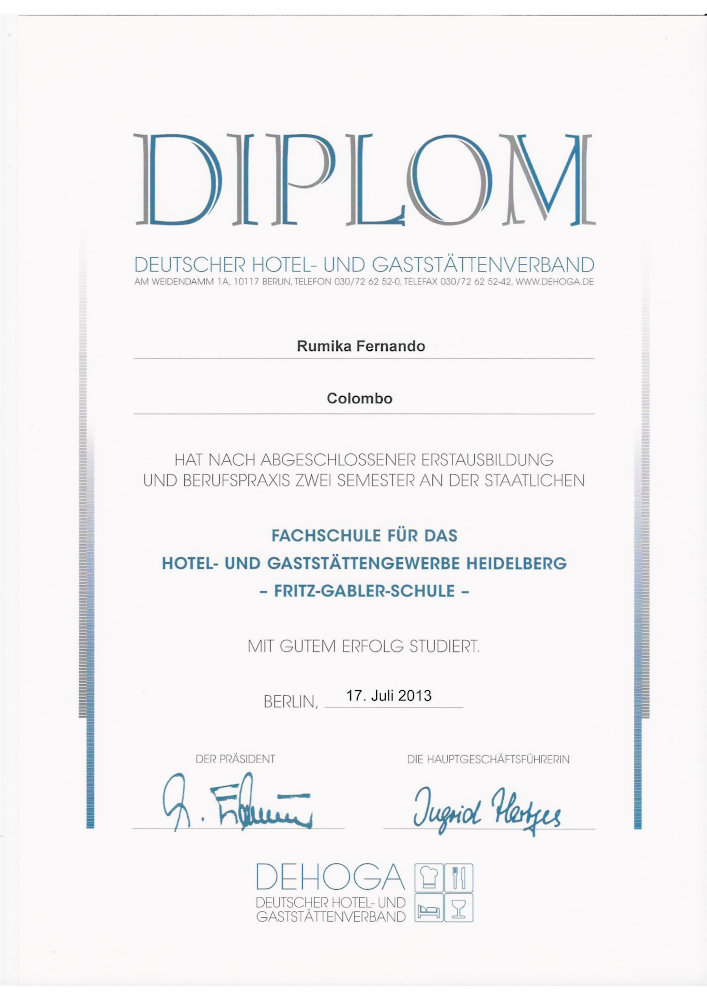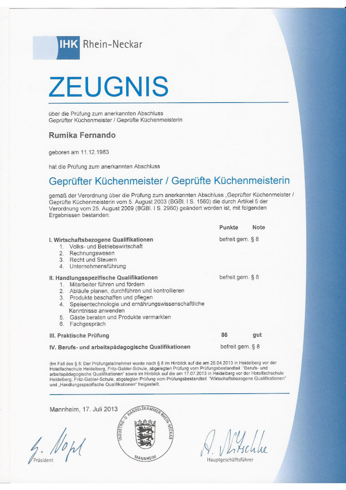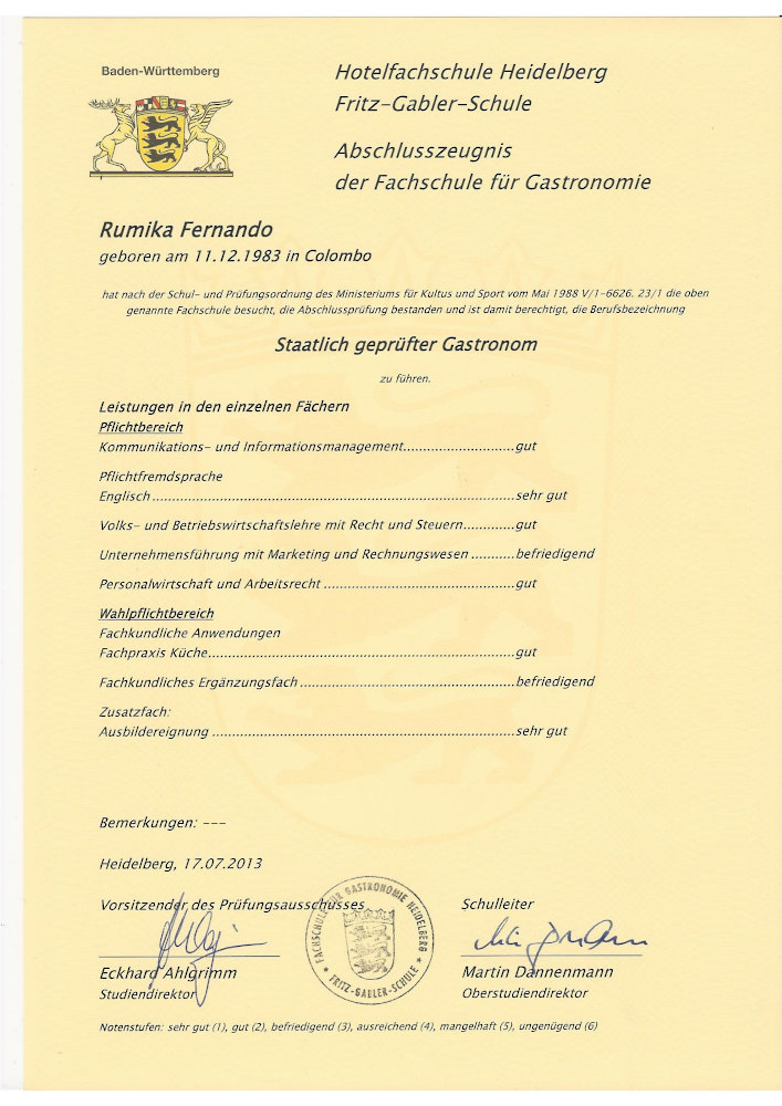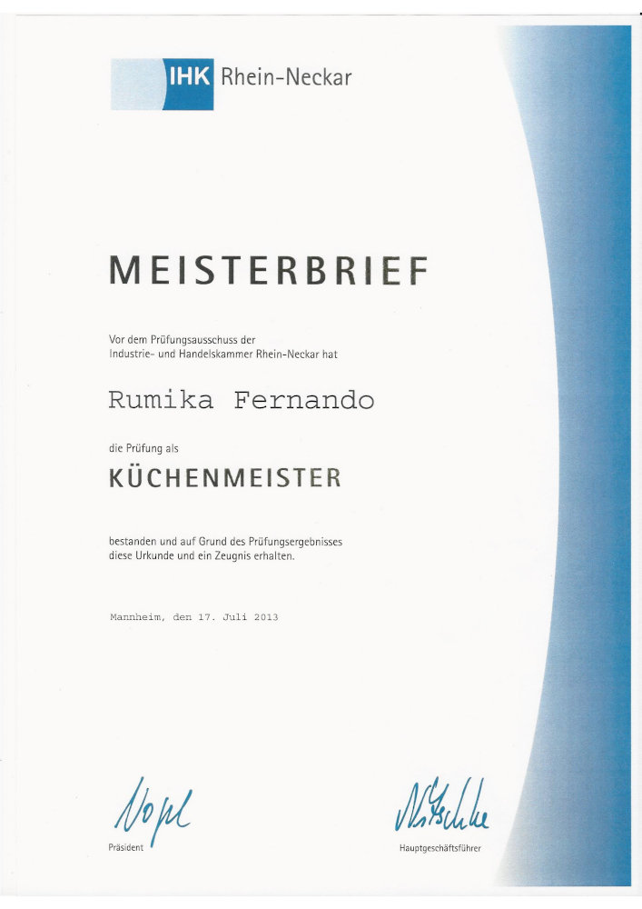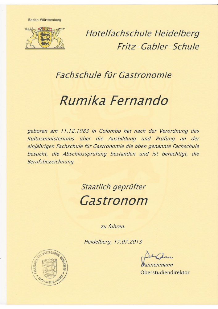 Für den staatlich geprüften Diplom-Gastronom und Küchenmeister Rumika Fernando sind Kochen und Gastronomie eine Passion. Nach seiner Ausbildung und vielen Stationen in Deutschland und der Schweiz war es soweit sich betriebswirtschaftlich weiterzubilden. Dieses geschah an der Hotelfachschule Heidelberg.